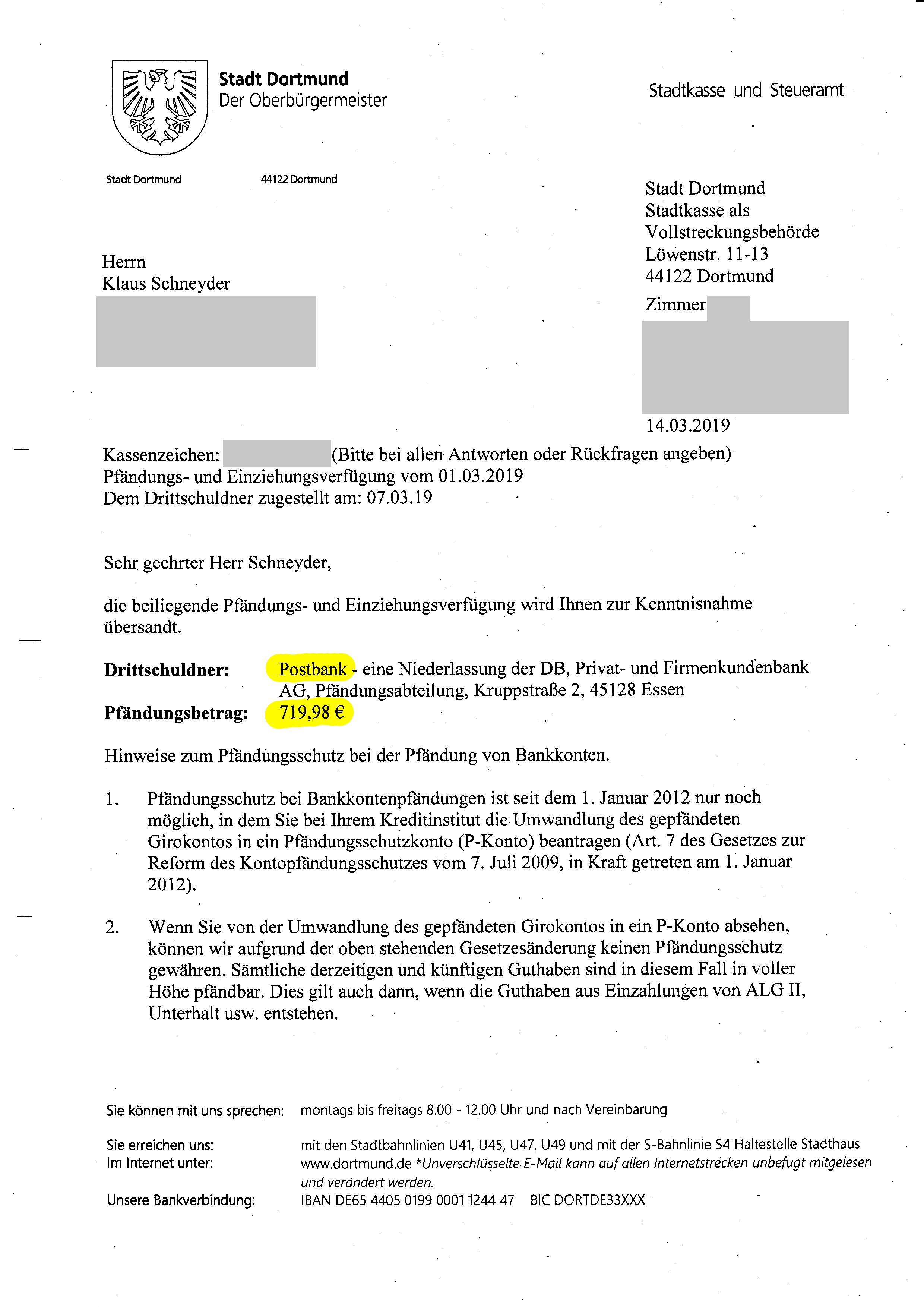 Die Pfändung hat bereits stattgefunden. Mit dem nun vorliegenden Pfändungsdokument der Stadt Dortmund werde ich diesmal keine Fehler machen und die Rechtsbehelfsbelehrung befolgen und sofort Widerspruch einlegen. Wie in der 1. Klage wird sich die Behörde dann selbst überprüfen und zu dem Schluss kommen, dass sie selbstverständlich alles richtig machen, woraufhin ich dann endlich das Recht habe, meine Klage zu erheben. Dann wird das Verwaltungsgericht dann endlich entscheiden müssen. Gut Ding will Weile haben...