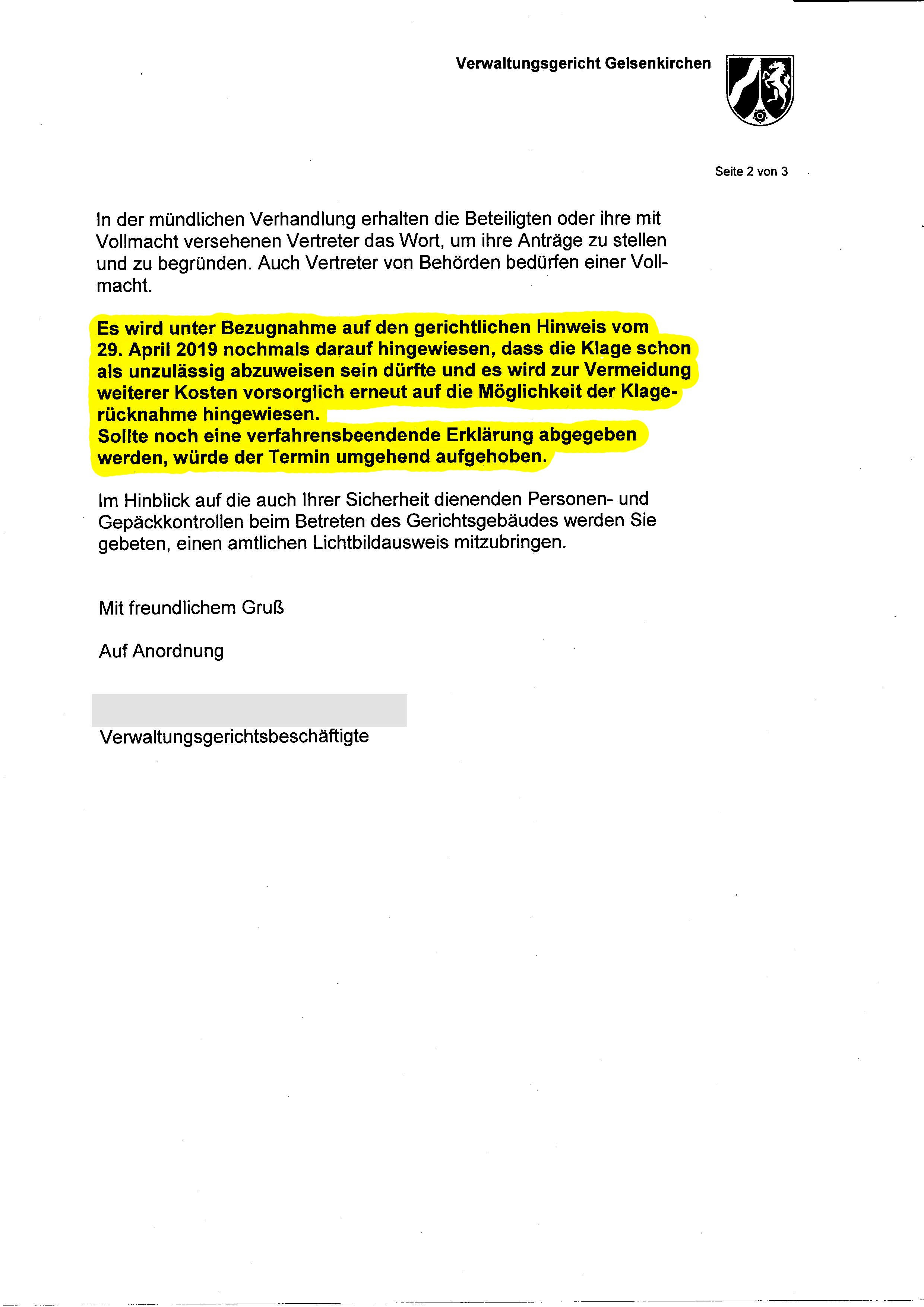 43) Schreiben vom Verwaltungsgericht Gelsenkirchen – Empfehlung der Klagerücknahme